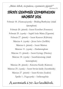 • A héten Hamvazószerda lesz, a nagyböjti időszak kezdete. Szigorú böjti nap: 18-60 éves életkor között egyszer szabad jóllakni, és még kétszer lehet kevés ételt magunkhoz venni; illetve 14 éves kortól hústilalom van, akárcsak a nagyböjti idő minden péntekén. A hamvazás szentelményét csak Hamvazószerdán szolgáltatjuk ki. Jöjjünk el mindannyian Hamvazószerdán, hogy együtt, közösségben kezdjük el a húsvétra felkészítő Szent Negyvennapot! A szentmise 18 órakor kezdődik.